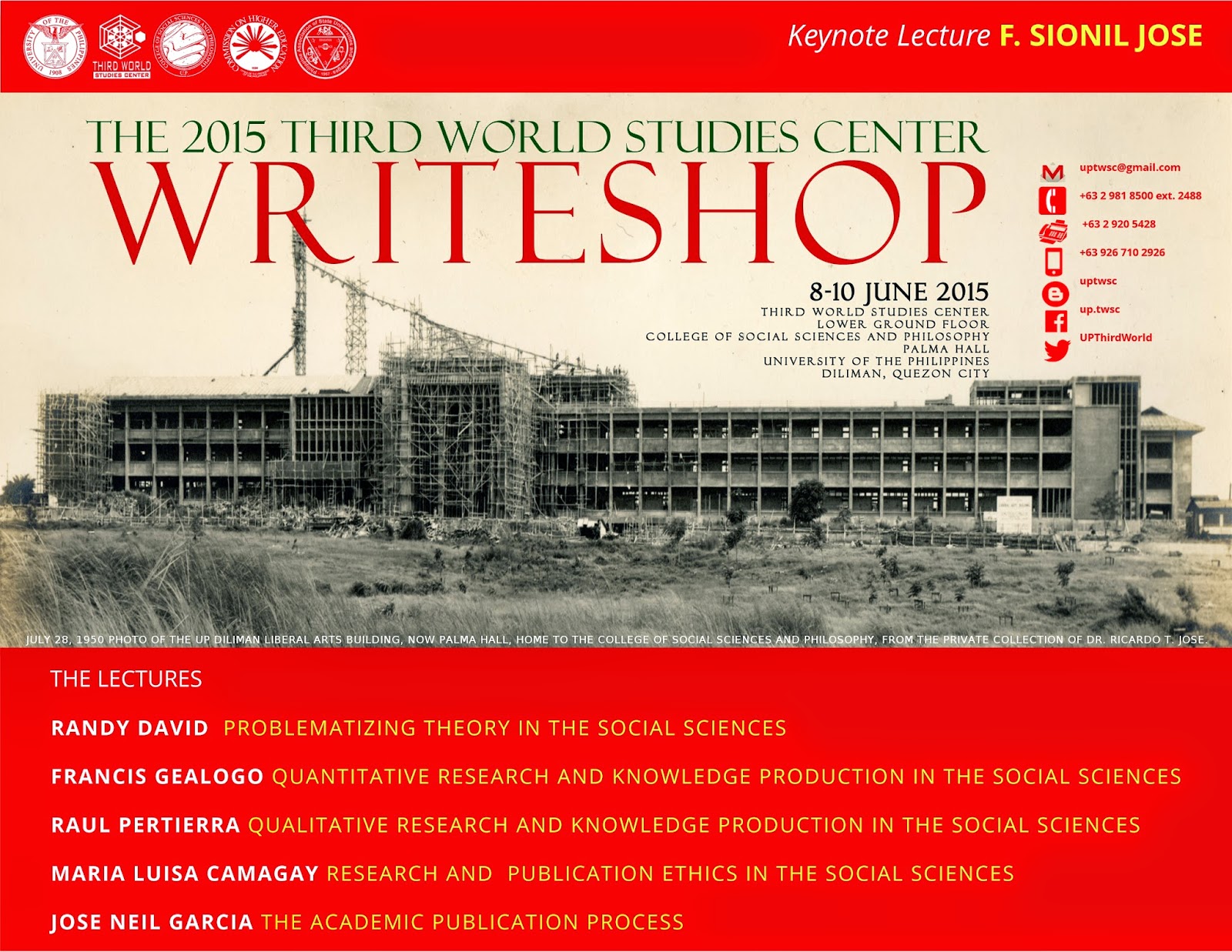 The Third World Studies Center (TWSC) launches the 2015 TWSC Writeshop in continuing its commitment to build the capacity of early career researchers, junior faculty members, and graduate students in the social sciences. Envisioning itself as a premiere social science research center in the College of Social Sciences and Philosophy, University of the Philippines-Diliman, the TWSC continues to develop critical, alternative paradigms to promote progressive scholarship by undertaking pioneering research and publishing original, empirically-grounded, and innovative studies. The 2015 TWSC Writeshop serves as a dais linking academic research and publication, where select participants are not only given the opportunity to interact with experts from the academe and the publishing industry, but also to produce a publishable manuscript for the TWSC’s internationally refereed and CHED-accredited (A-2, Very Good - Excellent) journal Kasarinlan: Philippine Journal of Third World Studies.